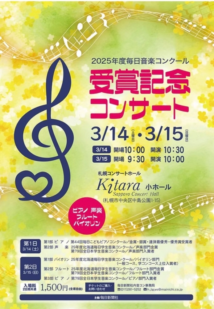 「毎日音楽コンクール受賞記念コンサート」ですね♪ 今年のピアノ部門(毎日こどもピアノコンクール)は、3月14日に札幌コンサートホールkitara小ホールで開催されます。